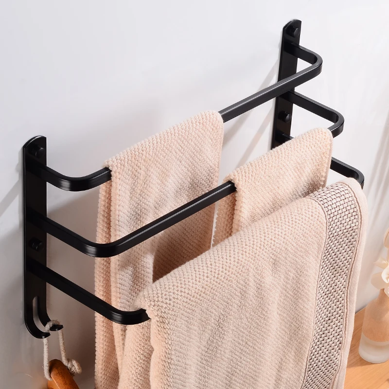 - Soporte de barra de toalla para baño, toallero de tres capas de aluminio negro, colgador de riel de toalla montado en la pared con ganchos, estante de ducha para Baño